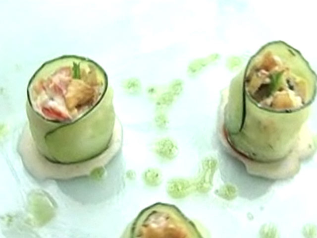 Оригинальный рецепт рулетиков из огурца.Состав:огурец — 1 штука;черри — 3 штуки;сыр — 15 гр;грецкий орех — 2 ореха;оливковое масло — 1 столовая ложка;йогурт — 2 столовых ложки;мята, перец, соль.