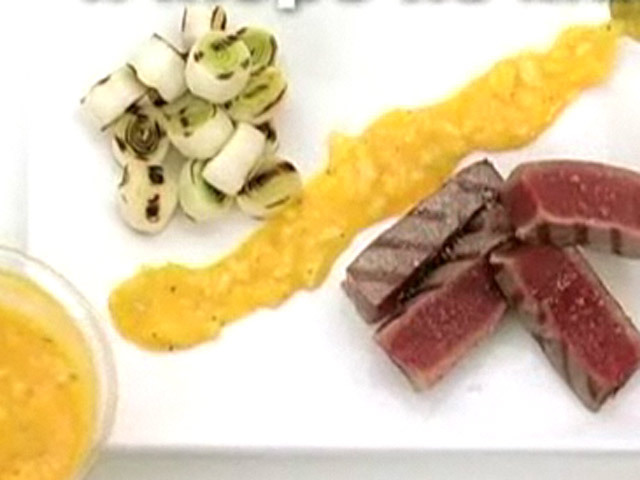 Низкокалорийный рецепт тунца с пюре из манго. 273 калории.Состав:порей — 1 стебль;манго — 50 гр;тунец — 100 гр;соевый соус, оливковое масло, имбирь, черный перец, соль.