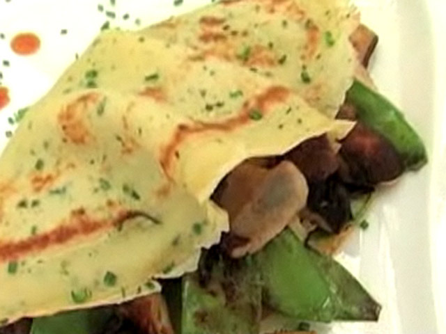 Низкокалорийный рецепт легкой закуски.289 калорий.Состав:горох — 10 стручков;шиитаке — 6 грибов;масло — 2 чайные ложки;вода — 1/4 стакана;соль, чеснок, соевый соус, блинчик.