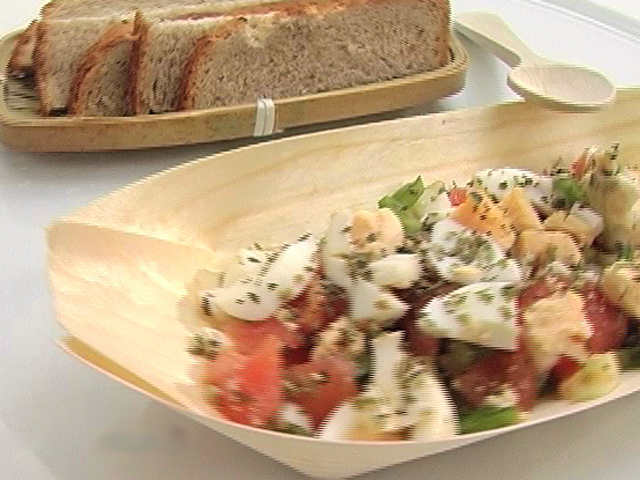 Пикантный салат для пикника.Состав:яйца — 2 штуки;помидоры — 2 штуки;огурец — 1 штука;перец — 1 штука;лук — 1/2 штуки;оливковое масло — 100 гр;чеснок — 2 зубчика;хлеб — 3 кусочка;соль, орегано, вишневый уксус — по вкусу.