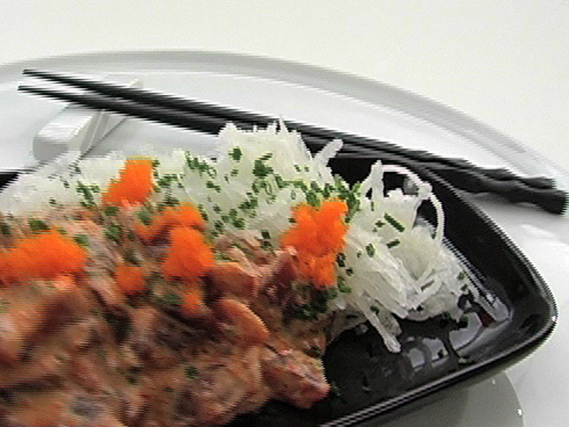 Новый вкус тунца.Состав:тунец — 200 гр;редька — 1 штука;майонез — 1 столовая ложка;зеленый лук — 1 пучок;тобико, кимоши соус — по вкусу.
